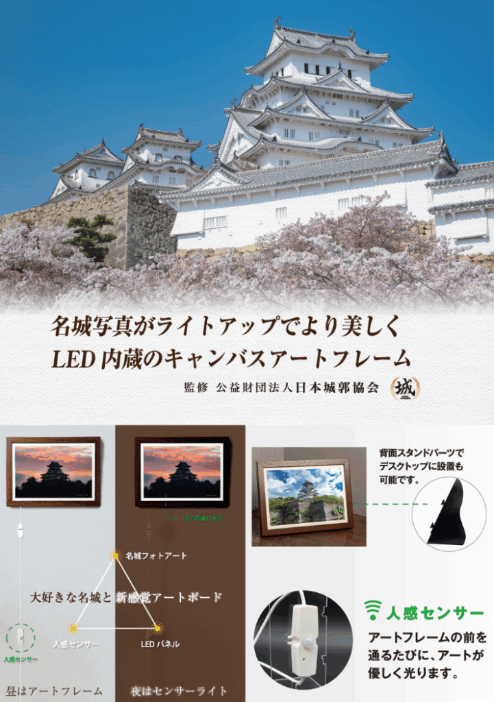 公益財団法人 日本城郭協会監修、LED内蔵のキャンバスアートフレームが株式会社デアゴスティーニ・ジャパンより発売されました。人感センサー付きで美しい名城アートがライトアップされます!