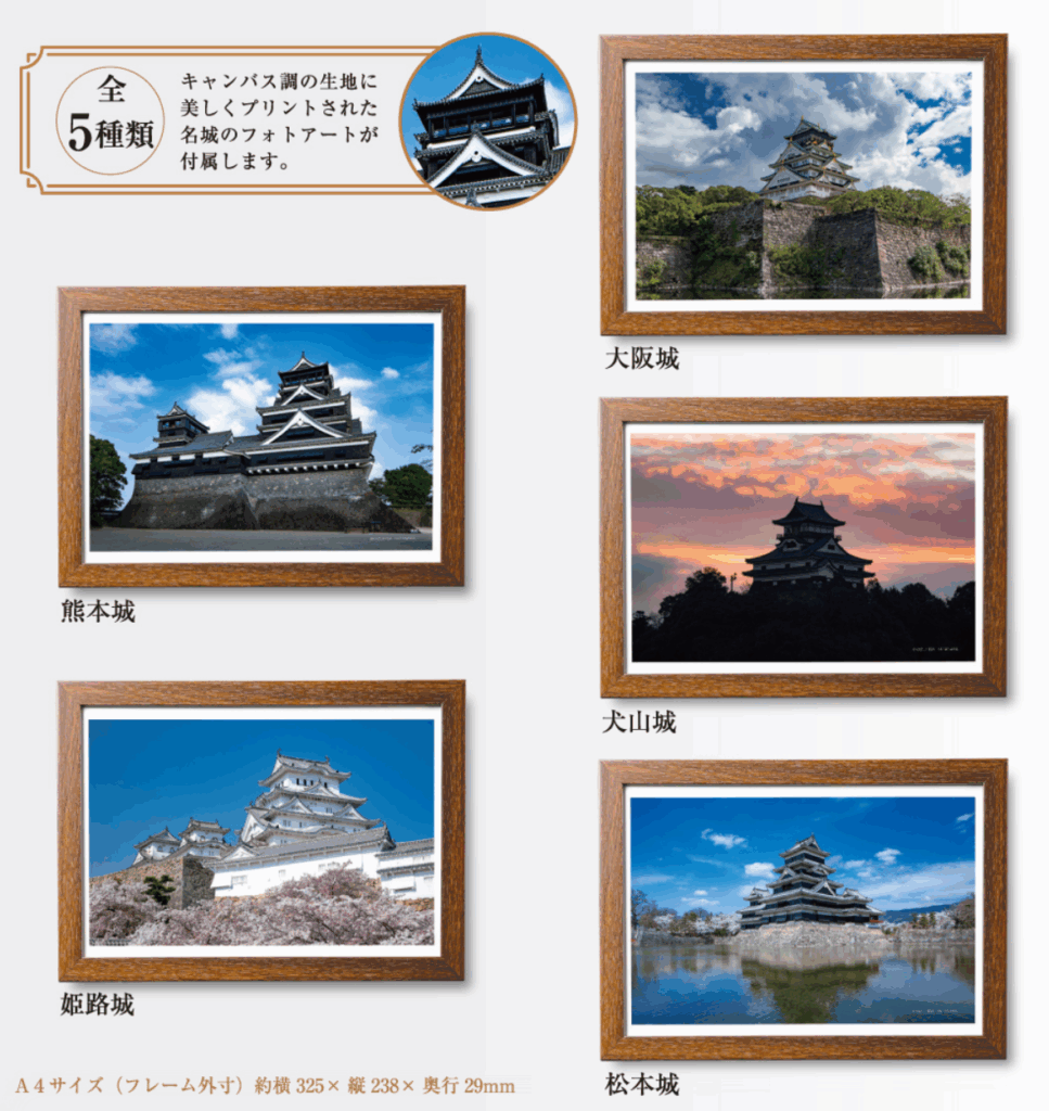 大阪城、熊本城、犬山城、姫路城、松本城の全5種類です。